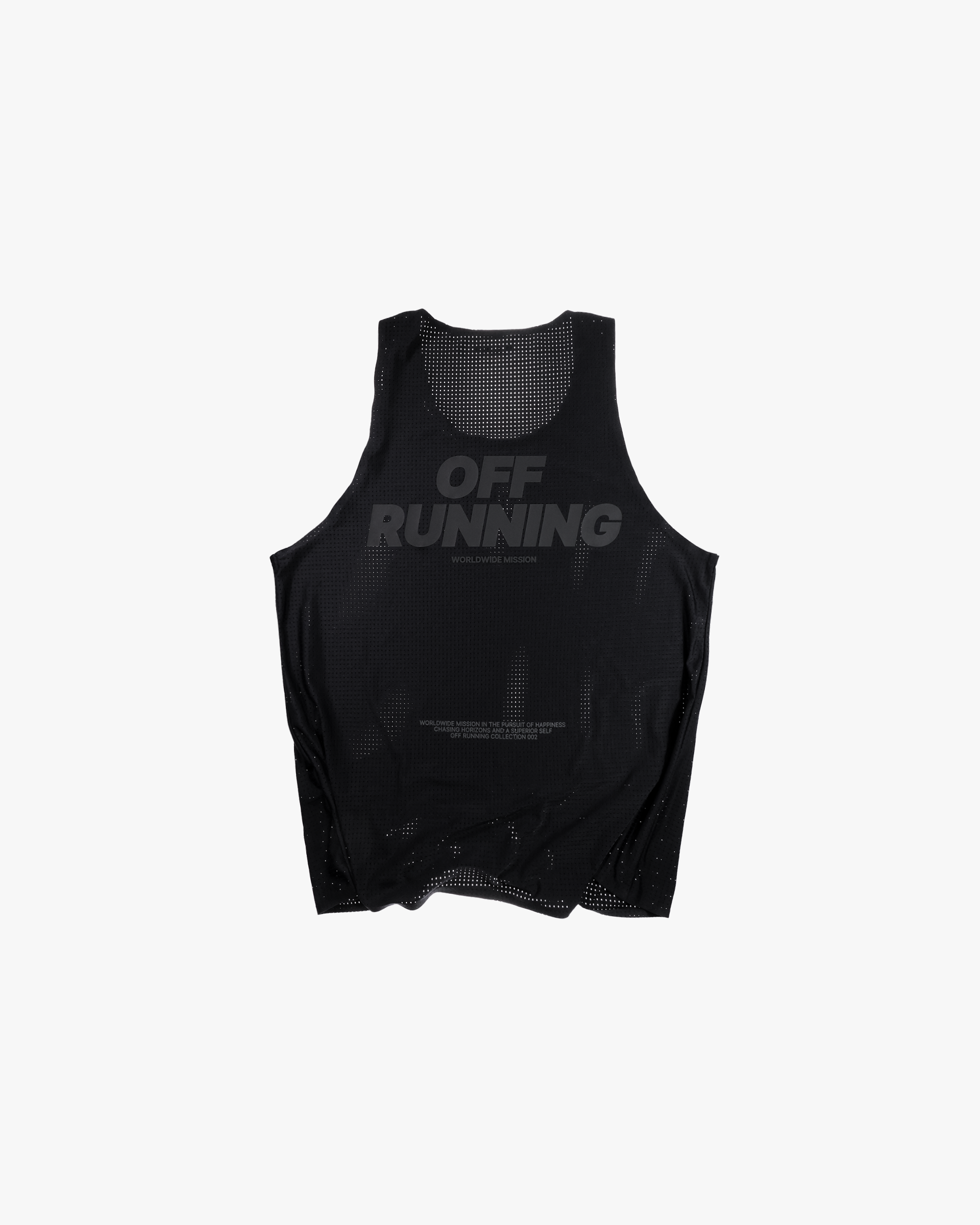 OFF RUNNING Minimal Performance Singlet combines premium craftsmanship with innovative design. The perforated hole system ensures optimal airflow, enhancing your body’s natural cooling system to keep you comfortable during intense runs. Glued tapered edges create a sleek, seamless finish, reducing friction and distractions so you can focus on your performance. Minimal OFF RUNNING branding on front side and back.