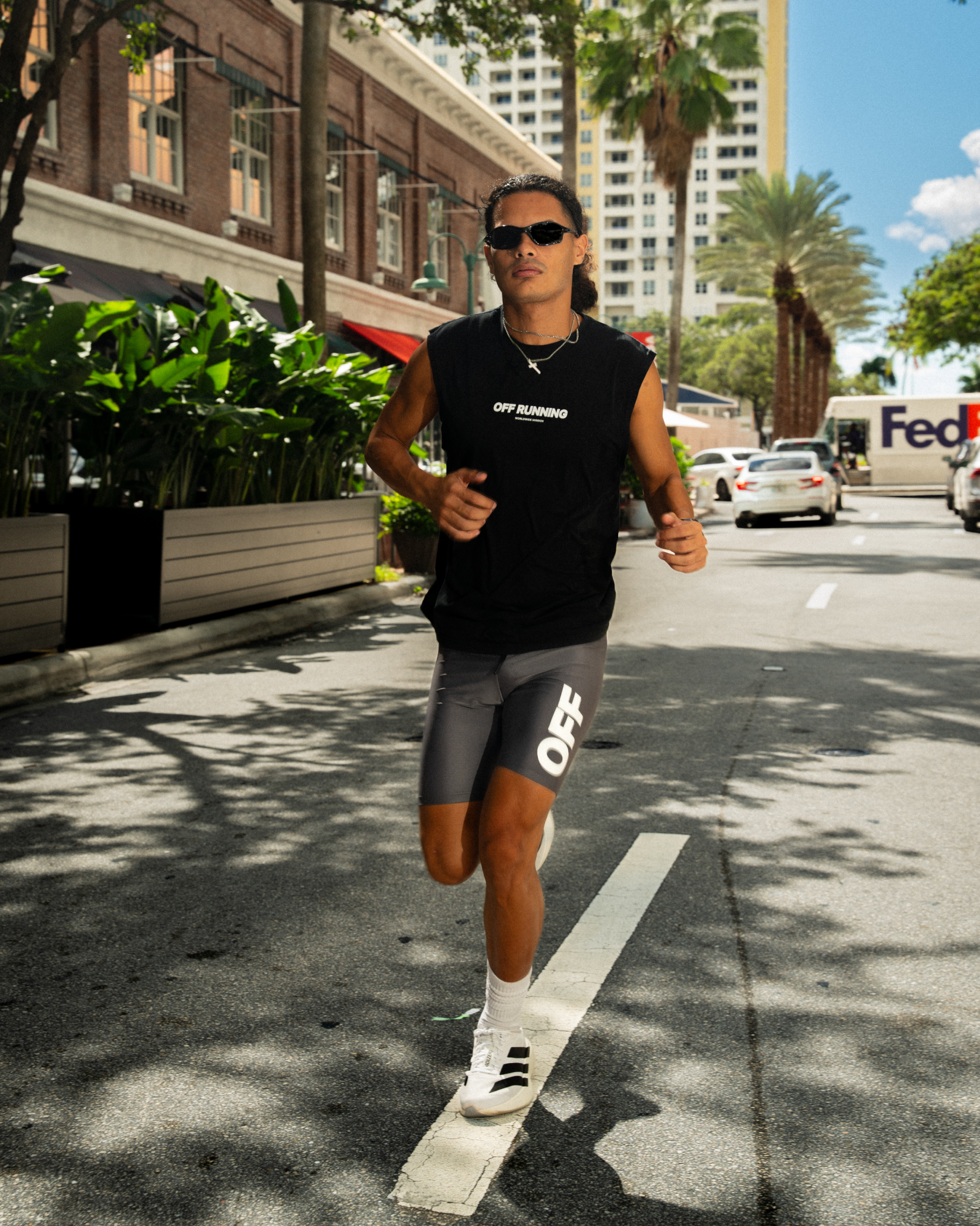 OFF RUNNING Half Tights engineered for race day performance, helping you elevate your run and achieve your personal best. Designed with seamless tapered edges for a clean, distraction-free fit, these half tights feature four interior pockets for gels, keys, or headphones, along with a secure back zipper pocket for your phone. The lightweight, moisture-wicking fabric keeps you cool and dry, while OFF RUNNING branding on the drawstrings and waistband reinforces the mindset that you're always OFF.